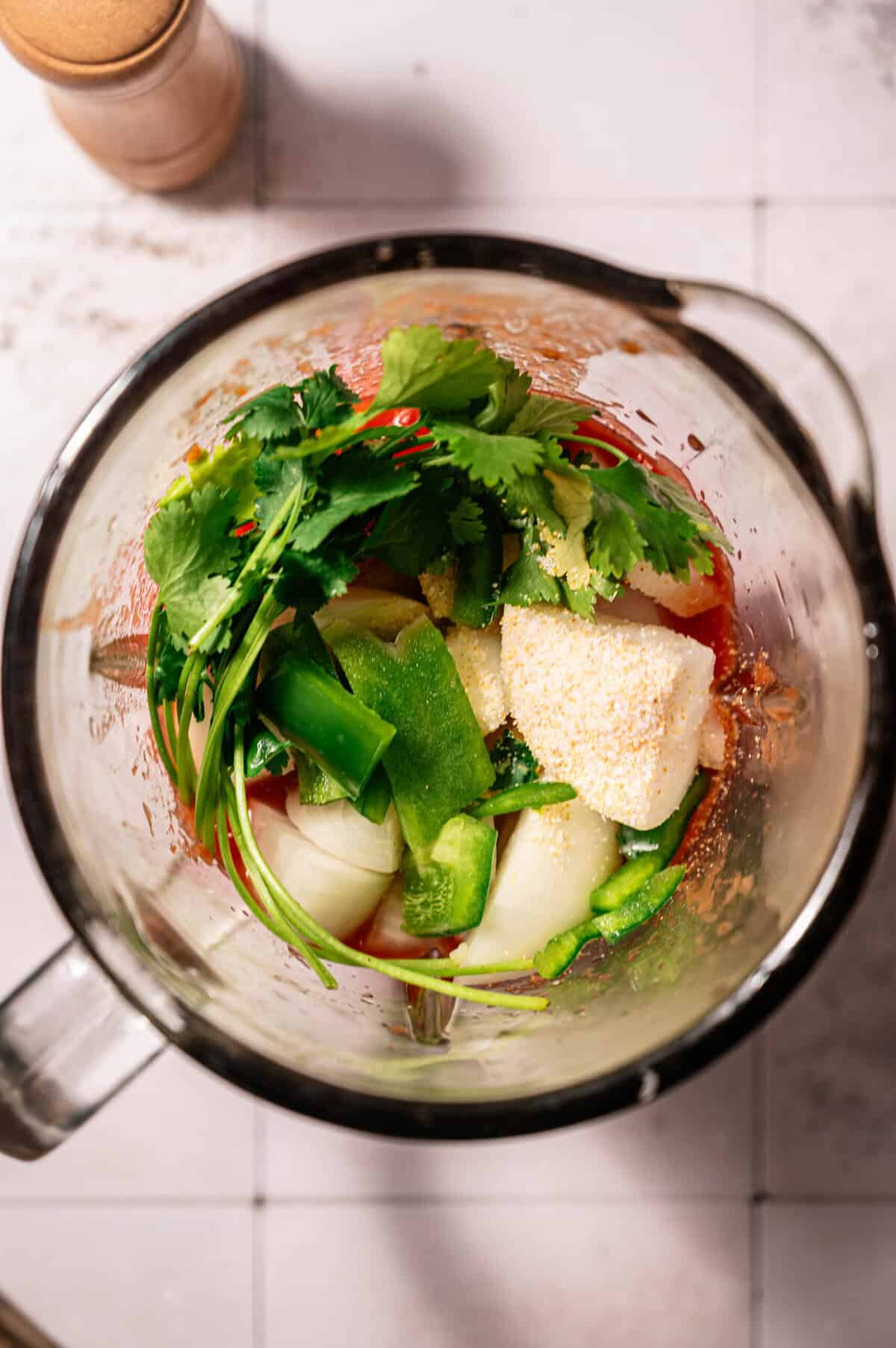 - Add diced tomatoes, onion, lime juice, garlic salt, cilantro, jalapeño, and salt to a blender.