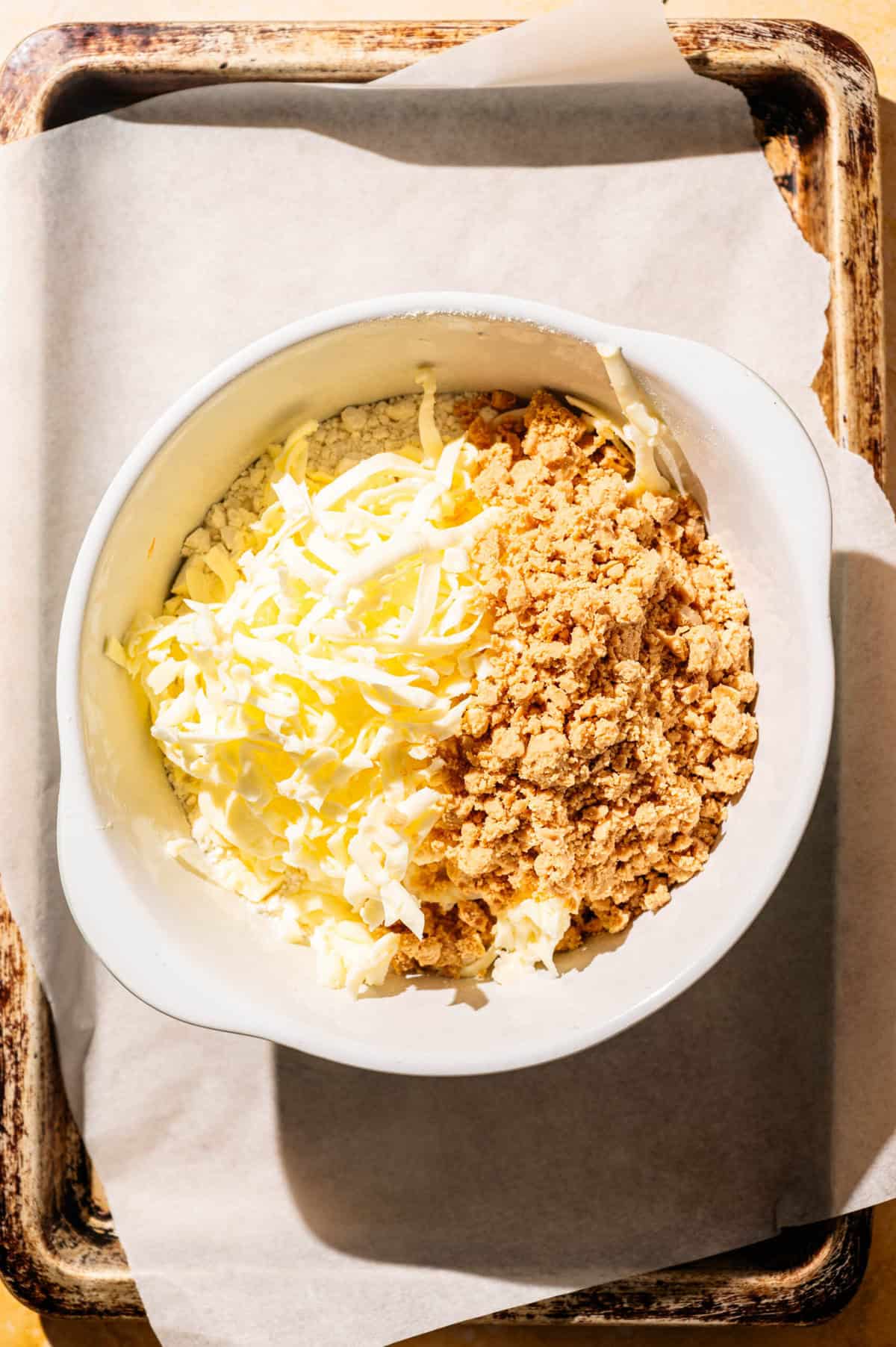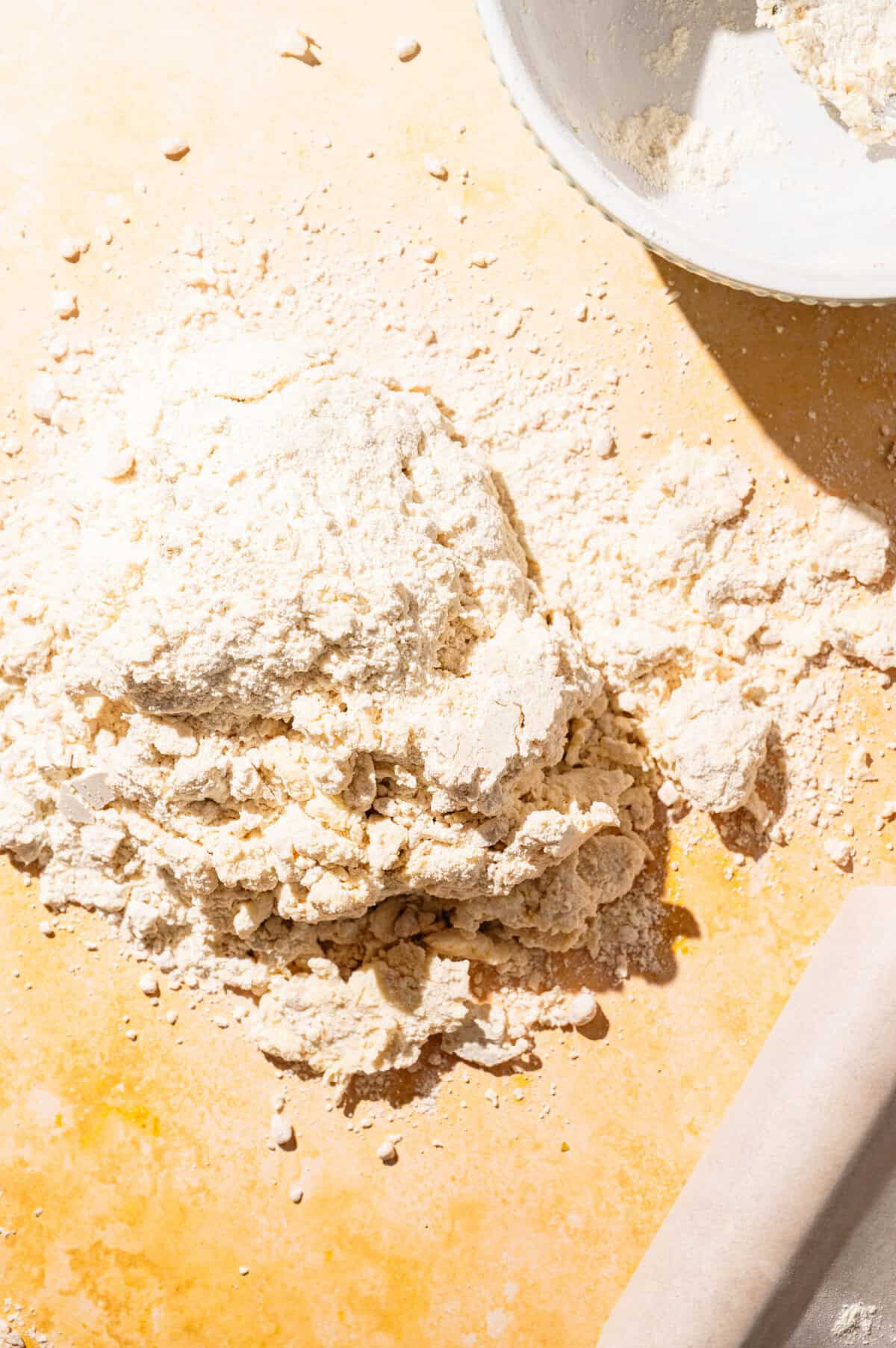 - In a large mixing bowl, combine the grated almond paste, grated frozen butter, and flour. Toss to mix until it looks like coarse crumbs.