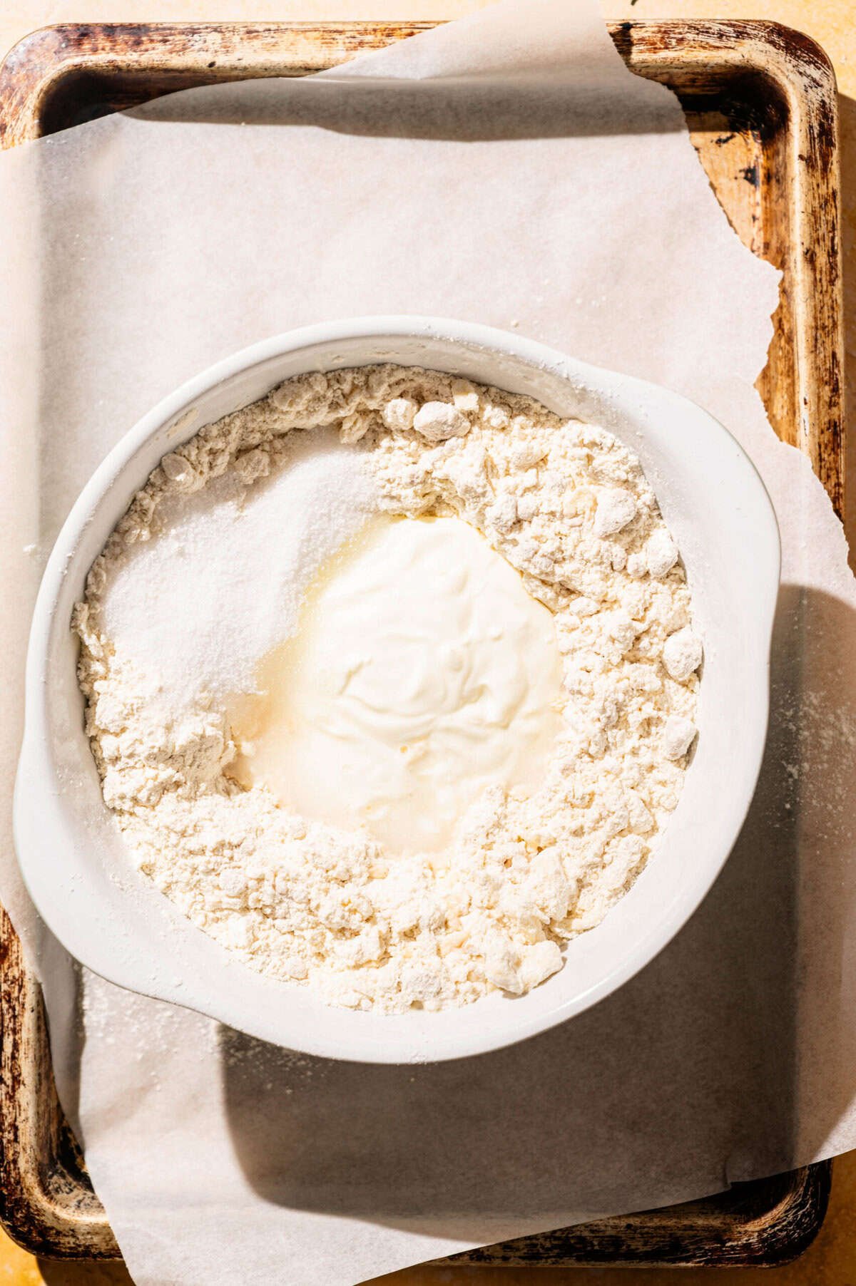 - Make a well in the center and pour in the chilled buttermilk and almond extract (if using). Add sugar if desired.