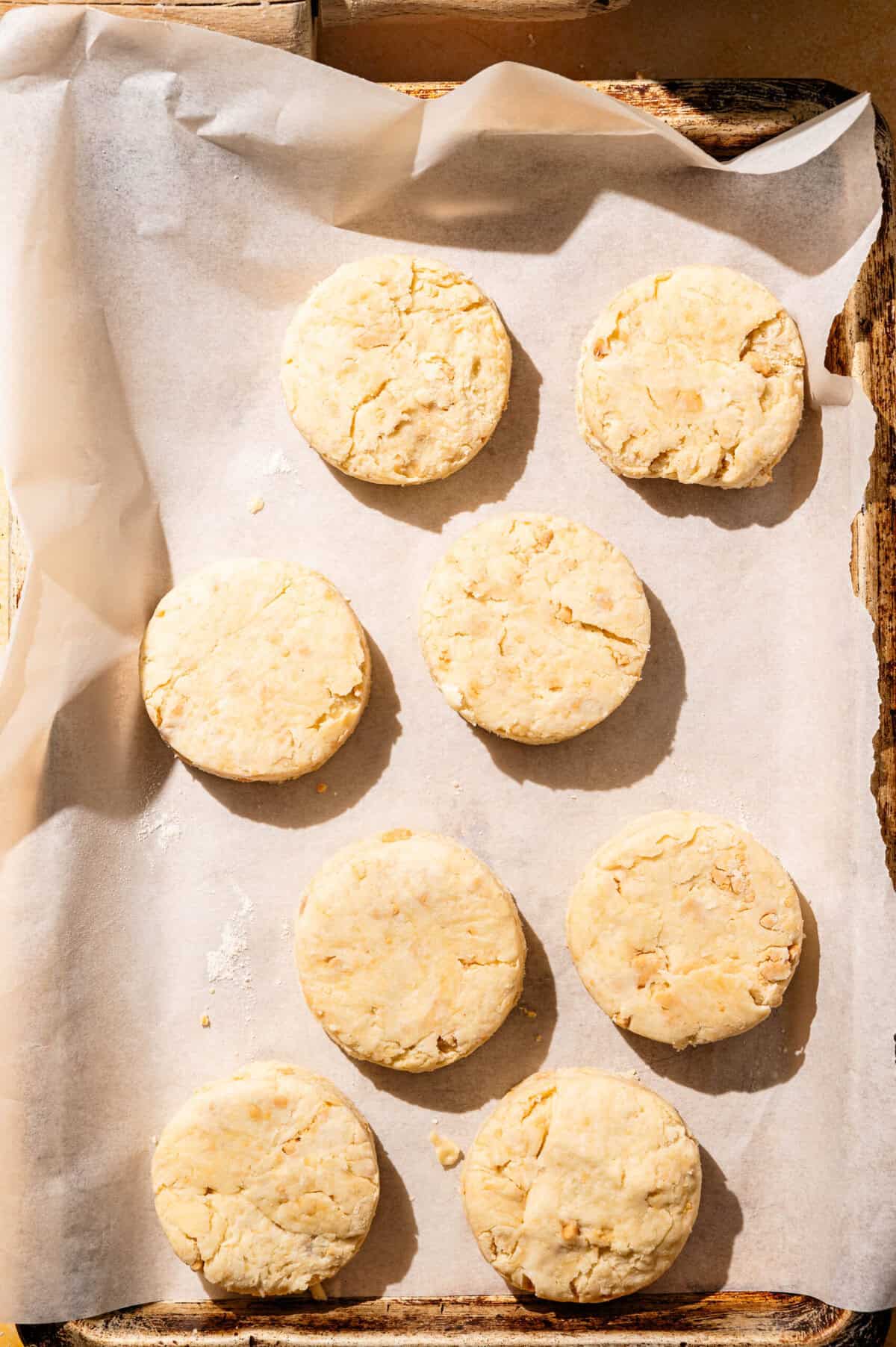 - Using a biscuit cutter, cut out biscuits and place them on a parchment-lined baking sheet or in a cast iron skillet.