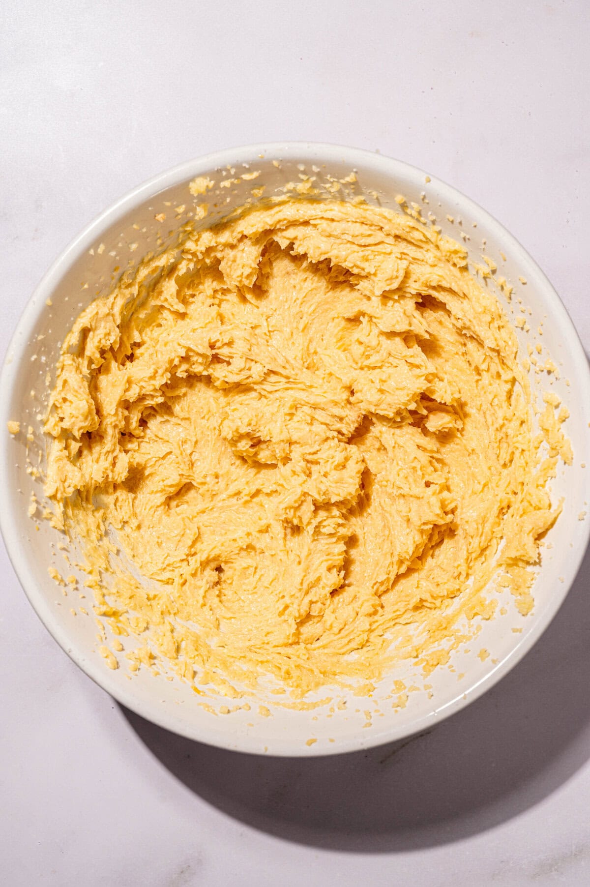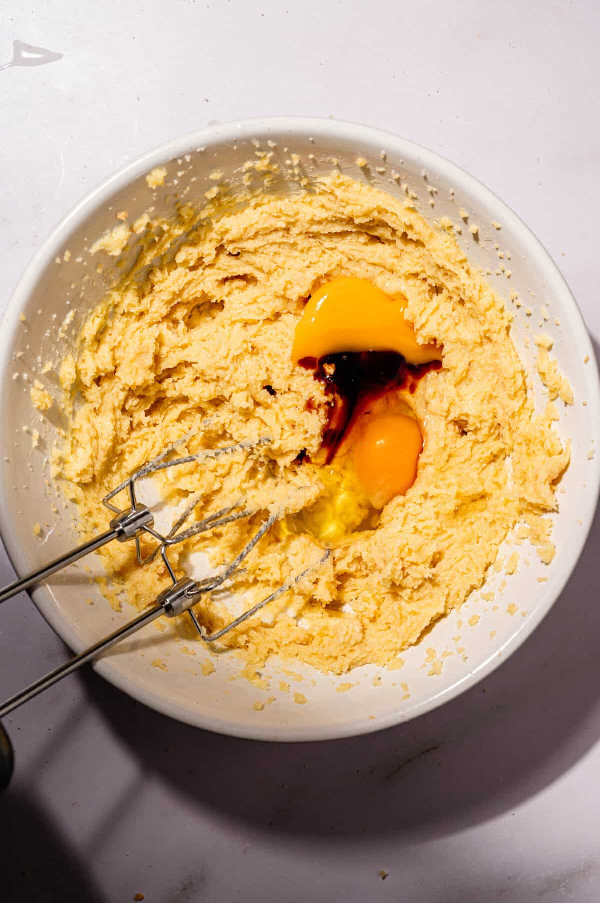 - Beat in the egg, egg yolk, vanilla, and almond extract until smooth and well combined, scraping down the bowl.