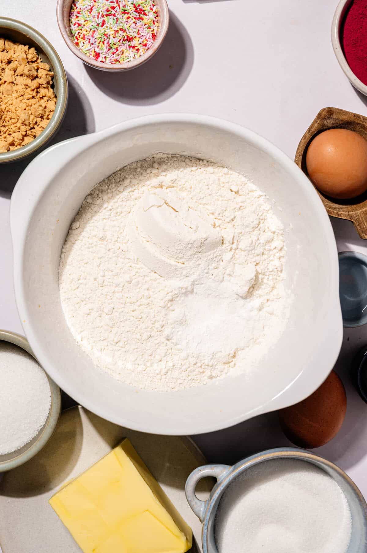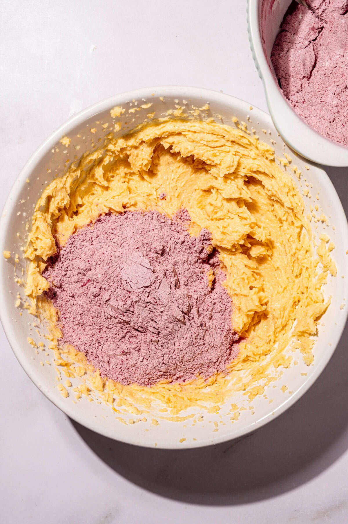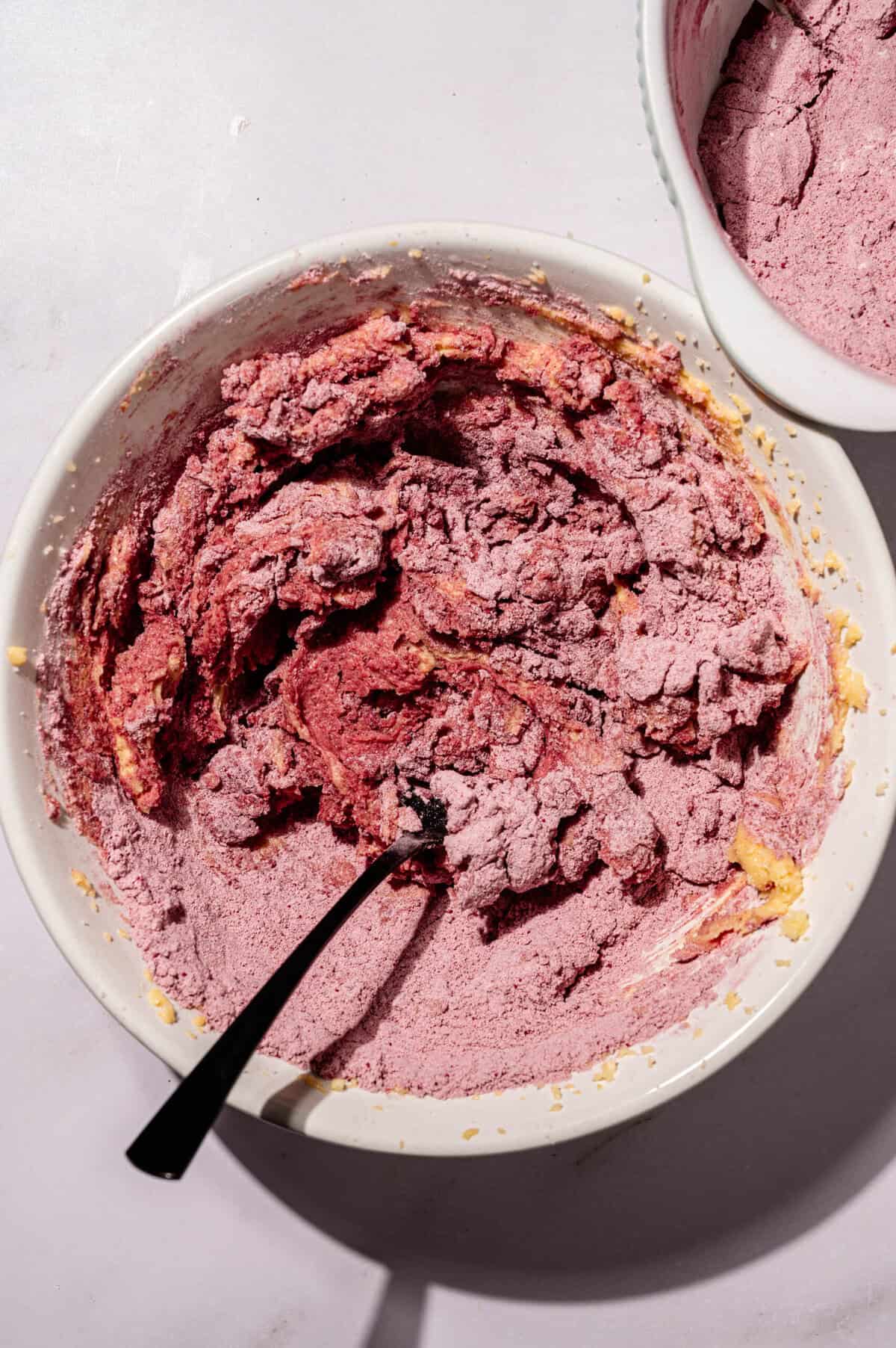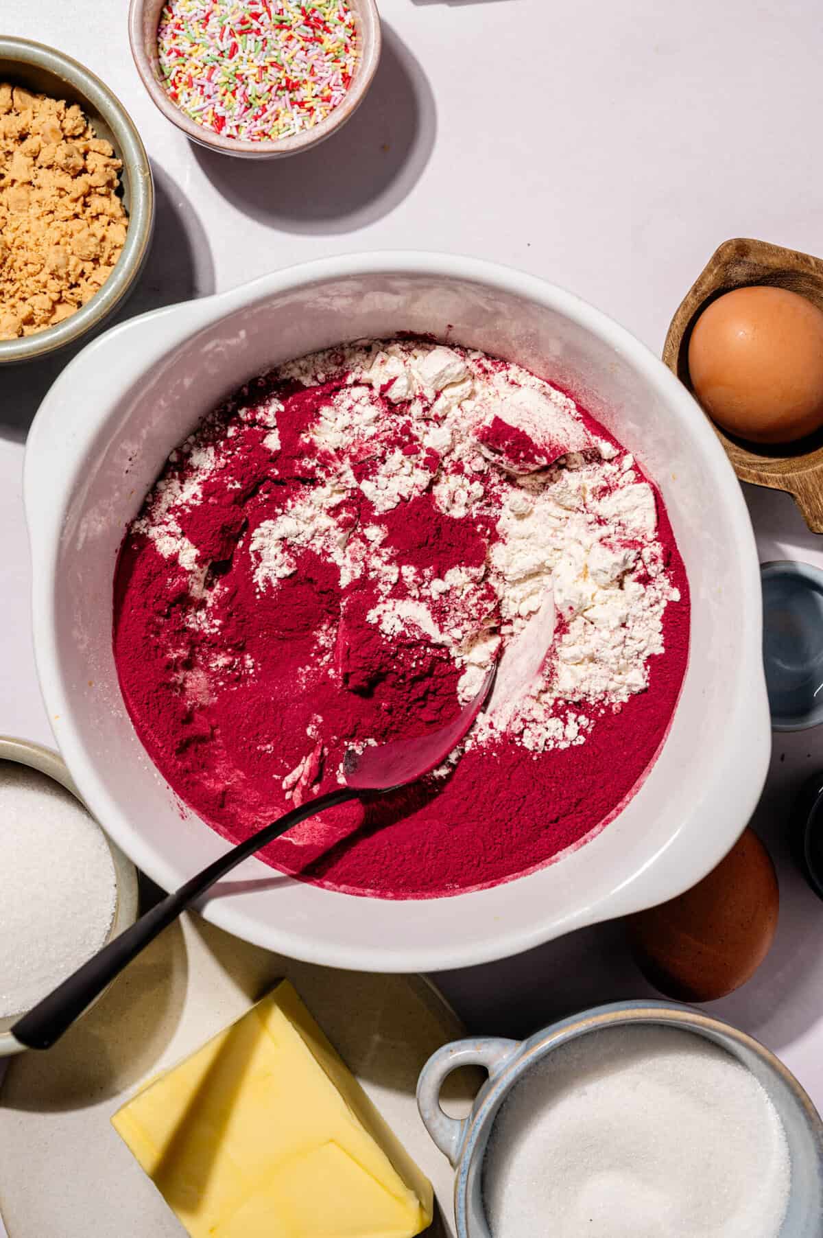 Whisk together your flour, baking powder, salt, and beet powder. The beet powder provides the beautiful color, so adjust based on how vibrant you want your cookies to be.