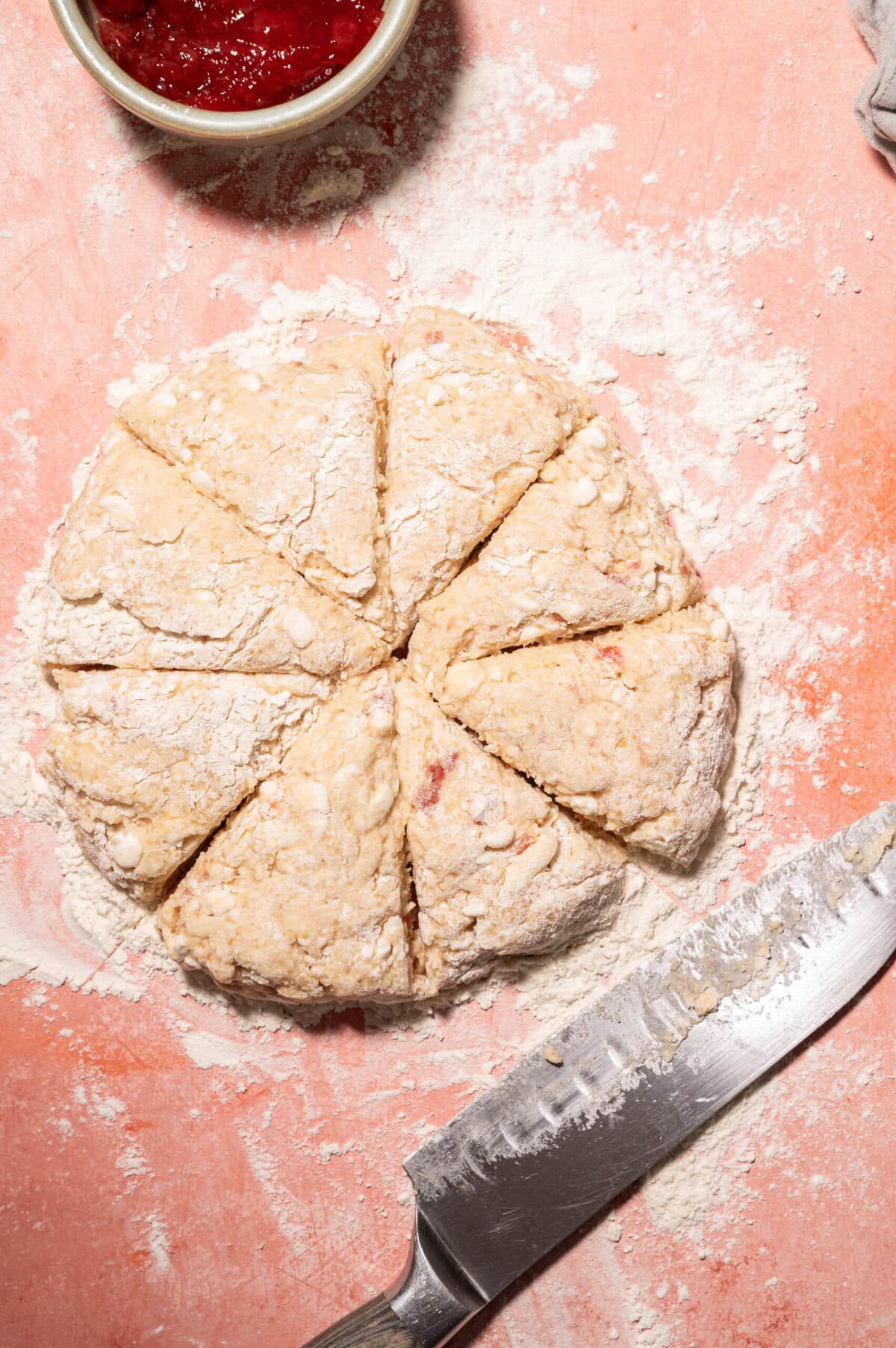 Turn the dough onto a floured surface and shape into a 7–8 inch round, about 1 inch thick. Cut into 8 wedges and freeze for 15 minutes.