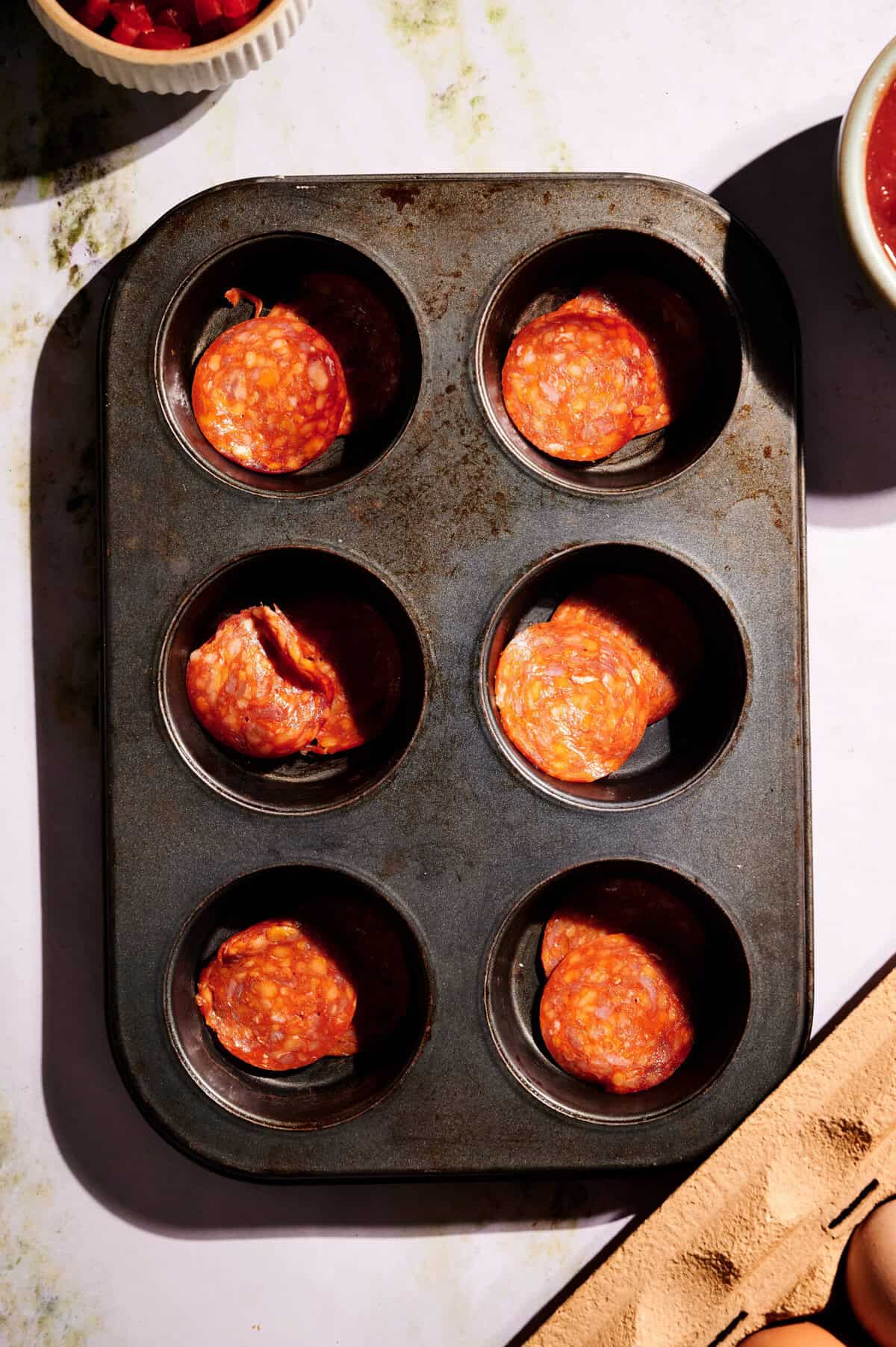 Place two slices of pepperoni at the bottom of each muffin cup.