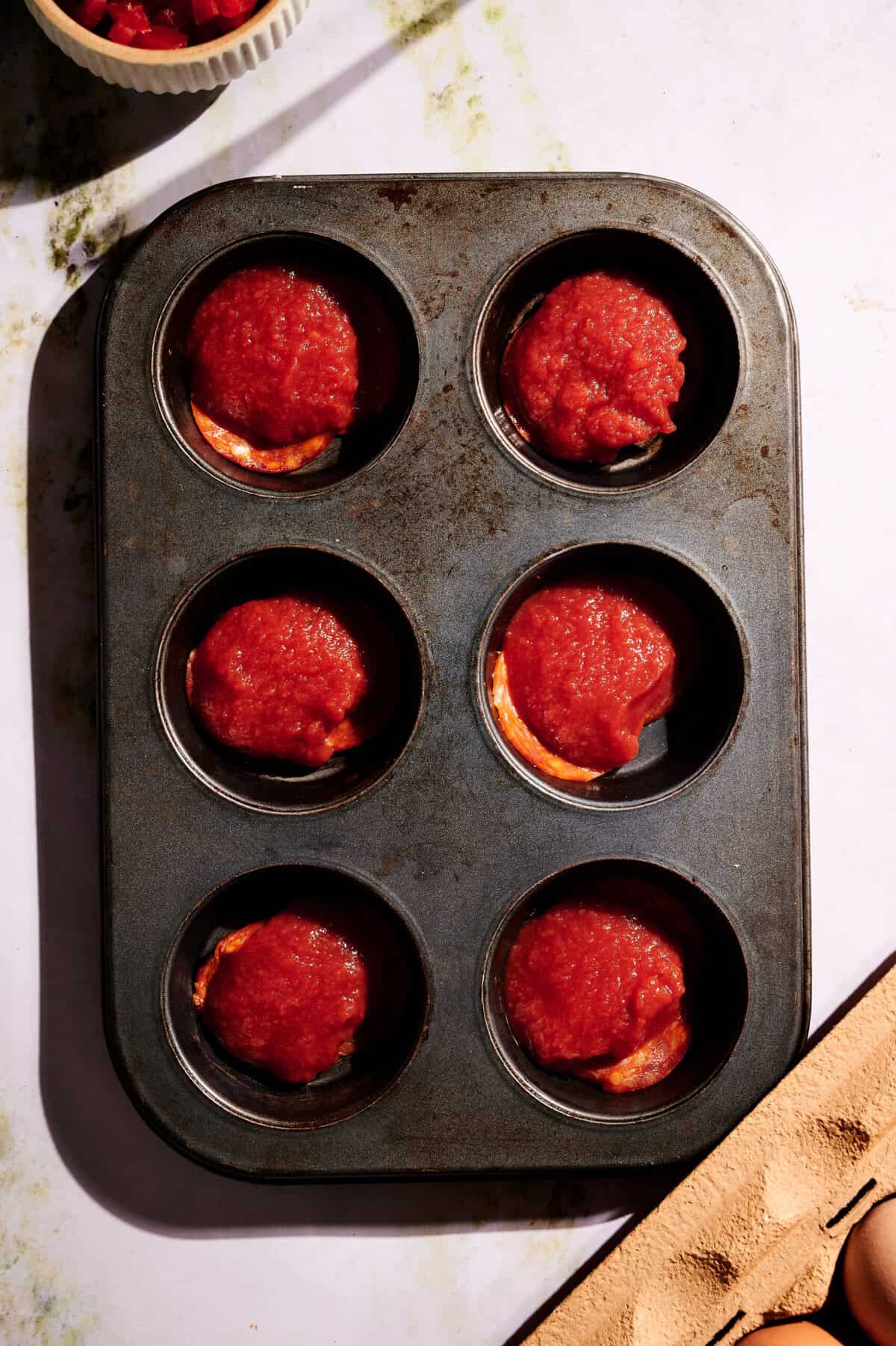 - Two slices of pepperoni at the bottom of each muffin cup.