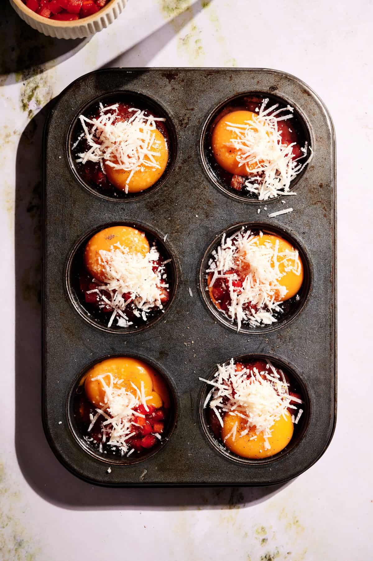 Sprinkle Parmesan Reggiano evenly across all cups.