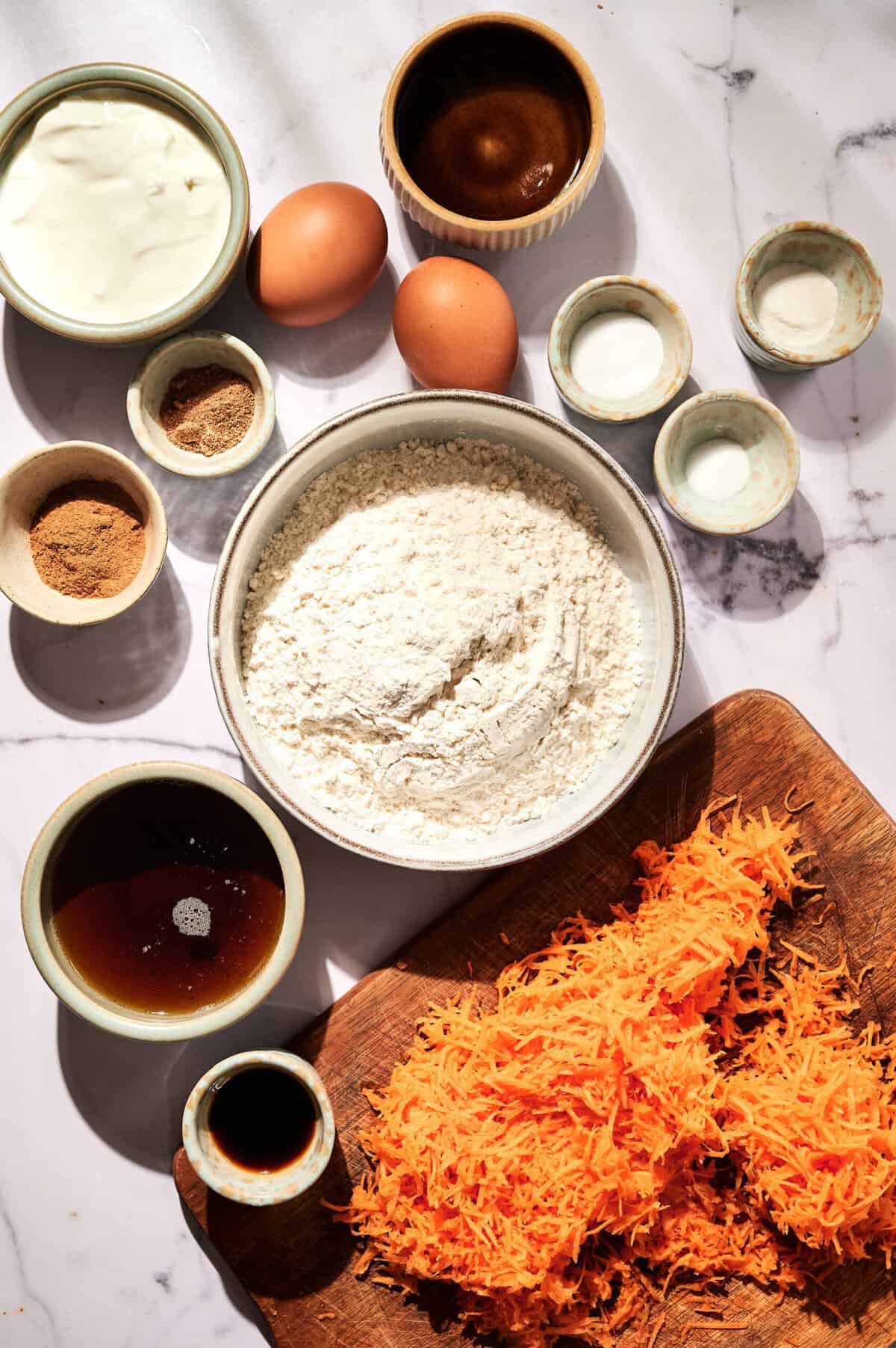 Preheat your oven to 350°F so it’s ready when your batter is. Line a 12-cup muffin tin with liners or grease it lightly with oil. Make sure your eggs are at room temperature and your carrots are grated before mixing, since this helps everything come together smoothly.