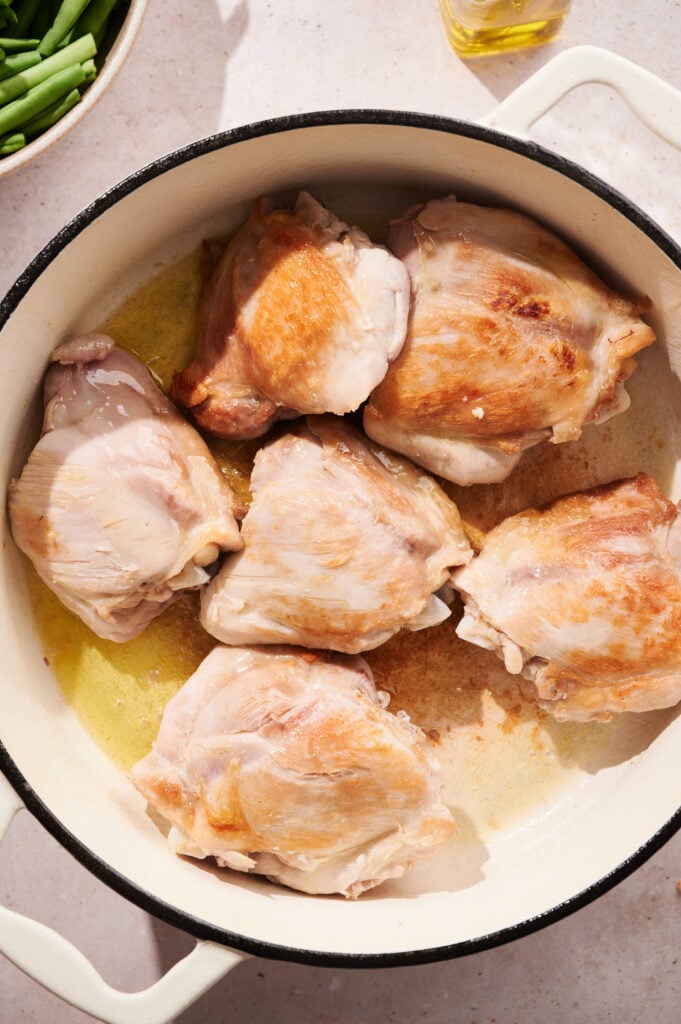 - Brown the chicken thighs on both sides for about 3-5 minutes.