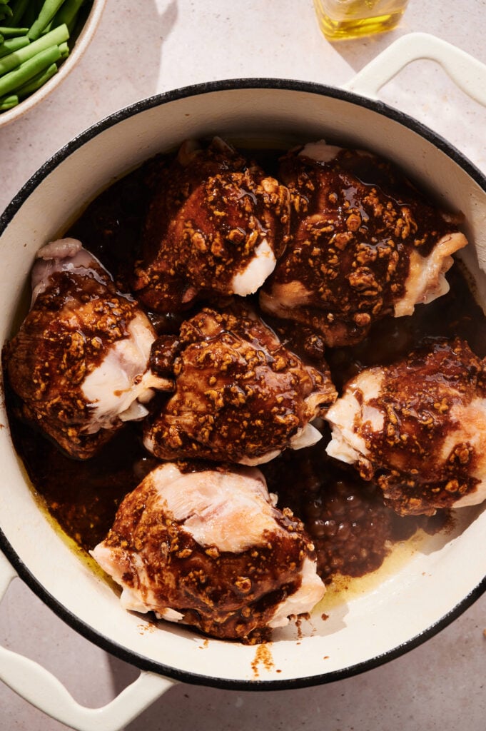 - Once the pan and oil are heated, add the chicken thighs to the skillet, reserving the leftover marinade for later.