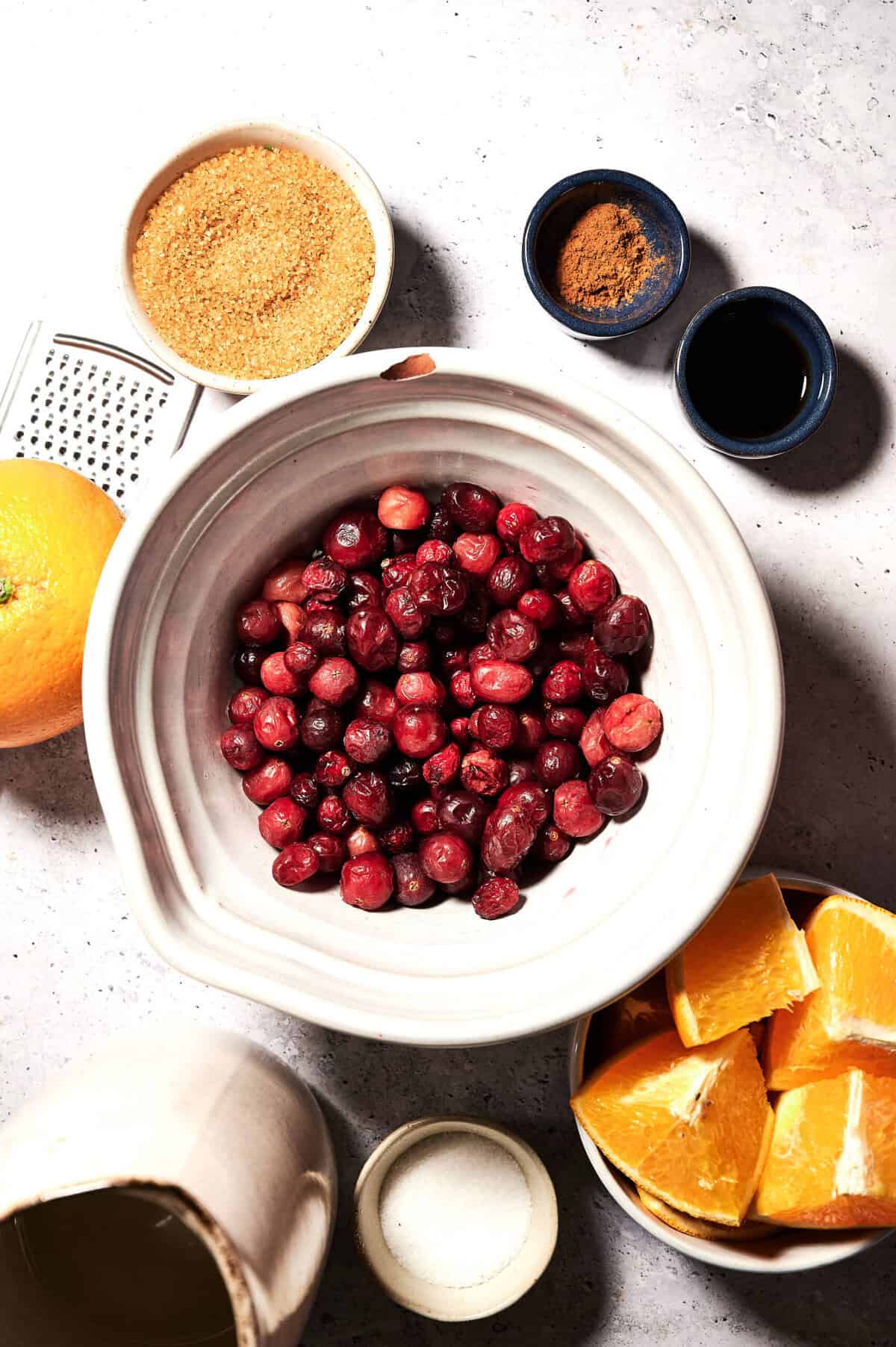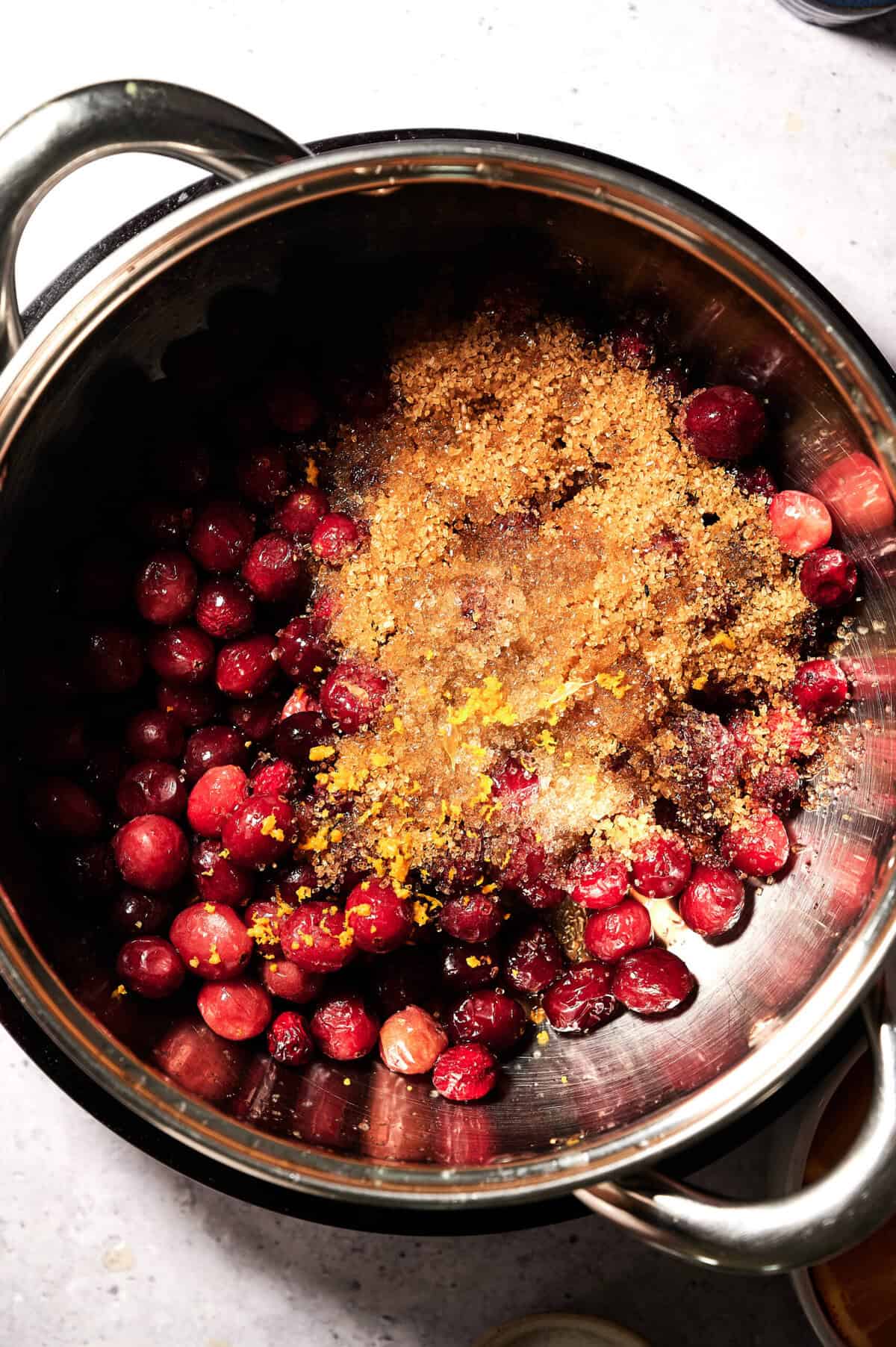 In a medium saucepan, add the cranberries, brown sugar, orange zest, orange juice, cinnamon, salt, vanilla extract, and water.