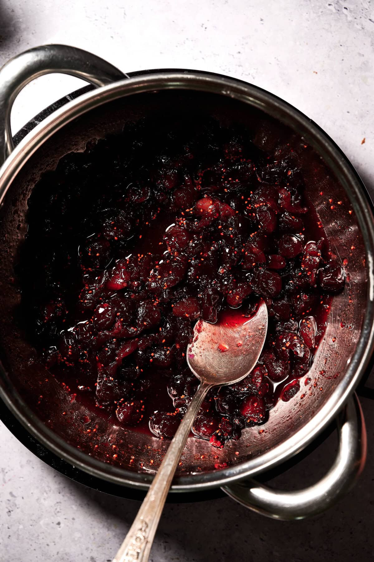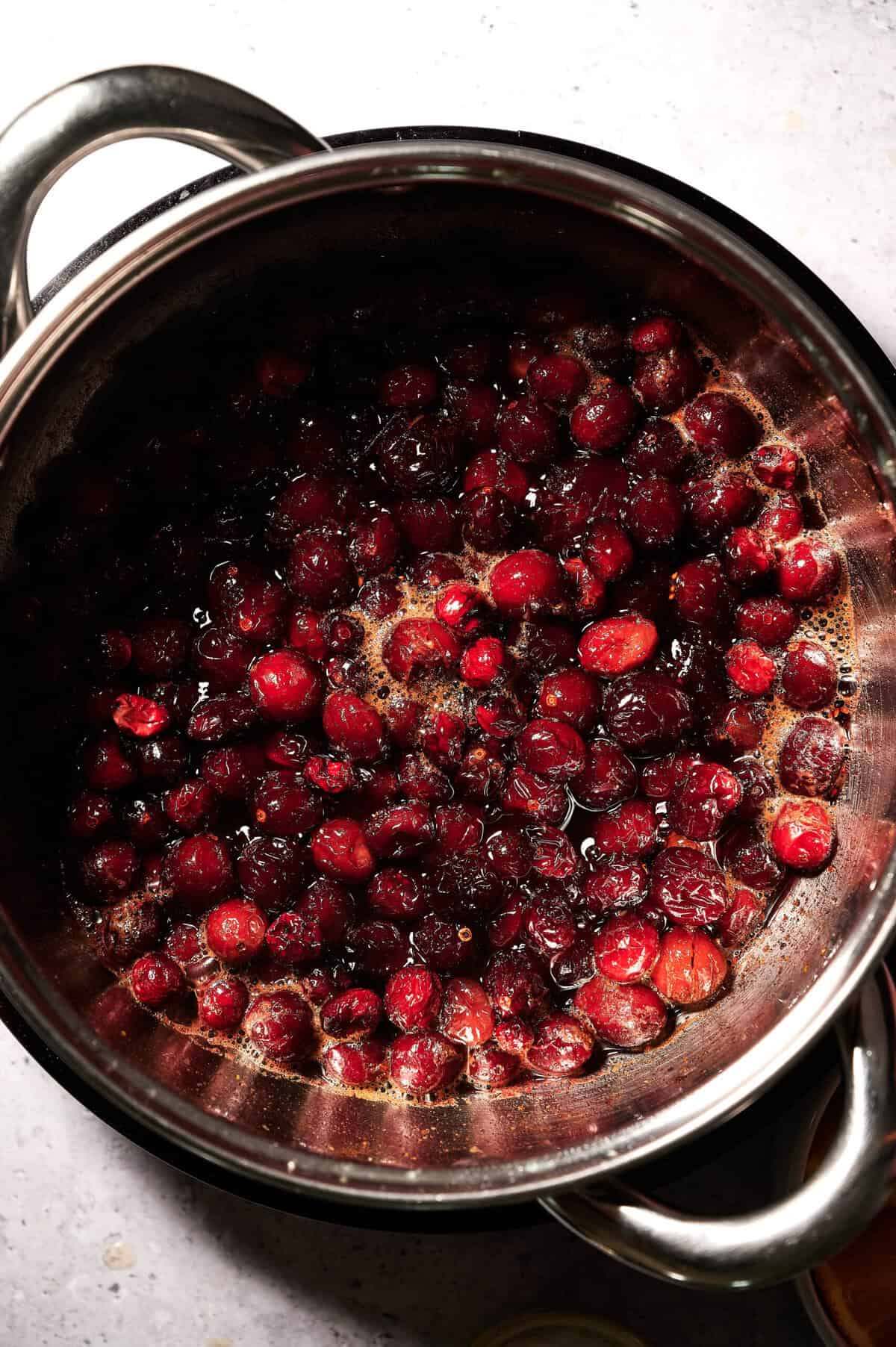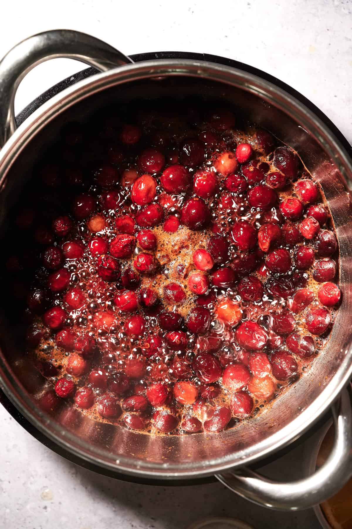 Reduce heat to medium and let the sauce simmer for 12–15 minutes, stirring occasionally. The cranberries will burst and the mixture will begin to thicken naturally.