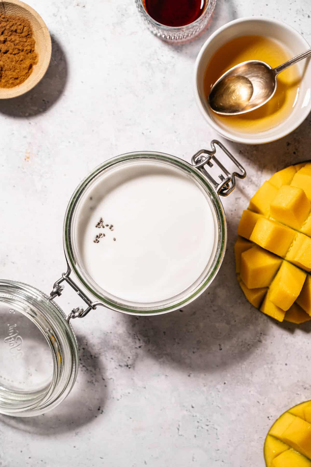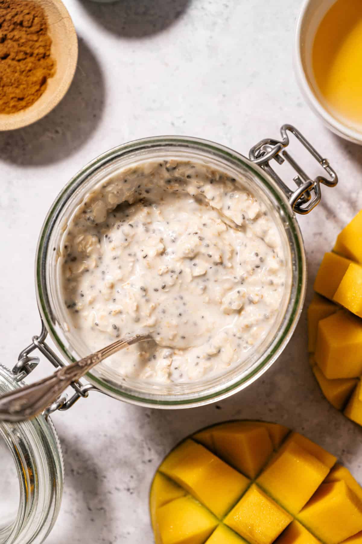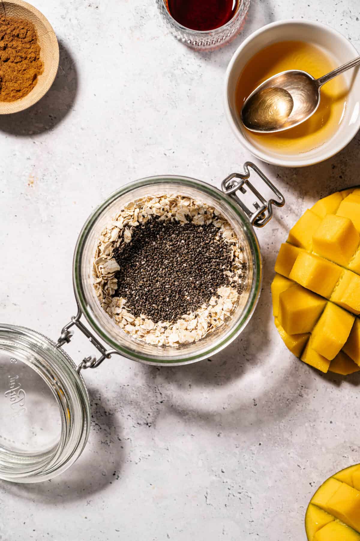 Add oats, chia seeds, coconut milk, sweetener, vanilla, mango, and a pinch of salt to a bowl or jar.