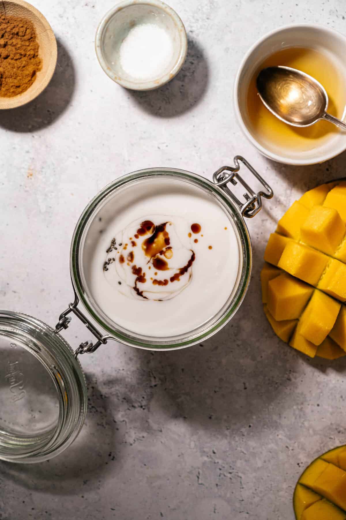 - In a bowl or jar, combine oats, chia seeds, coconut milk, sweetener, vanilla, mango, and salt.
