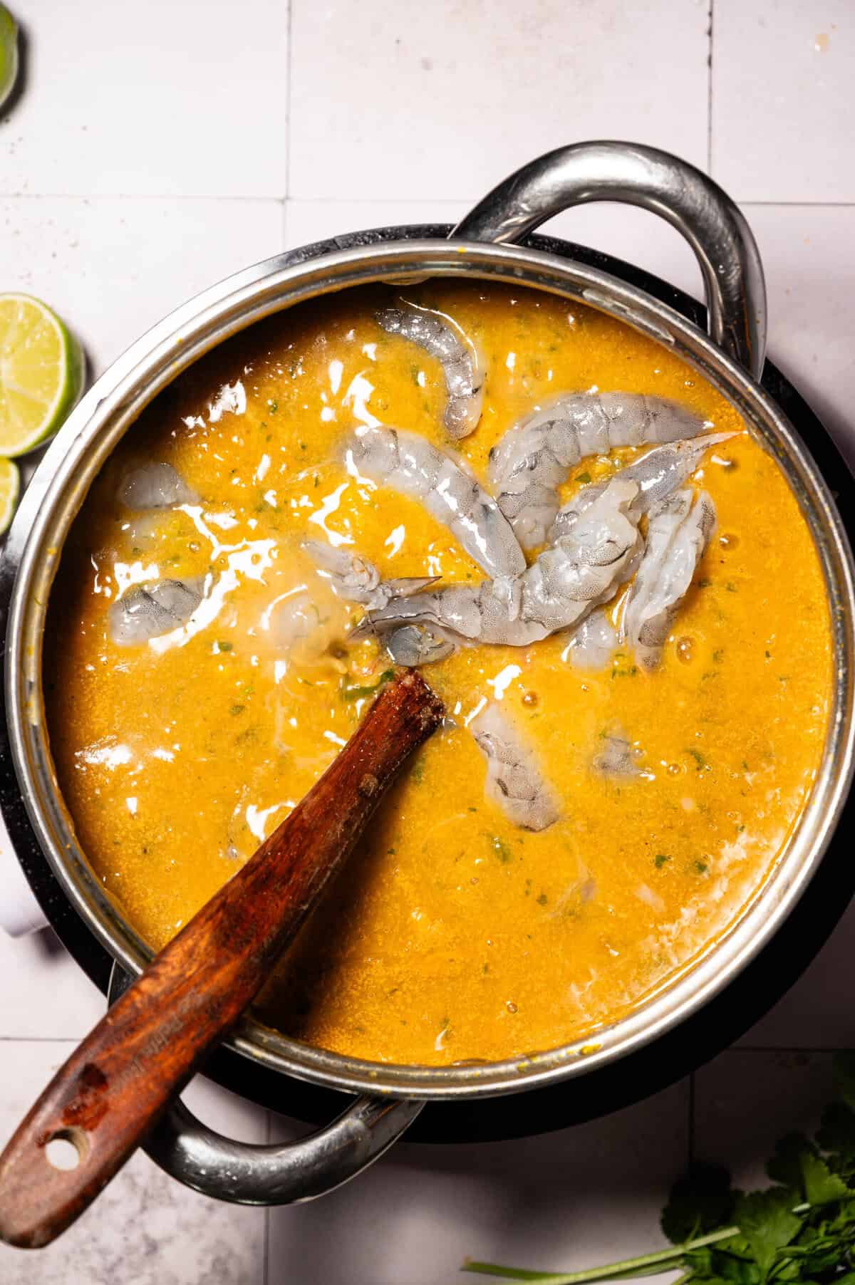 - Fill a large pot halfway with water and add the shrimp with shells. Cook until just pink, about 3–4 minutes. Remove the shrimp, peel and devein them, and set aside while reserving the cooking broth.