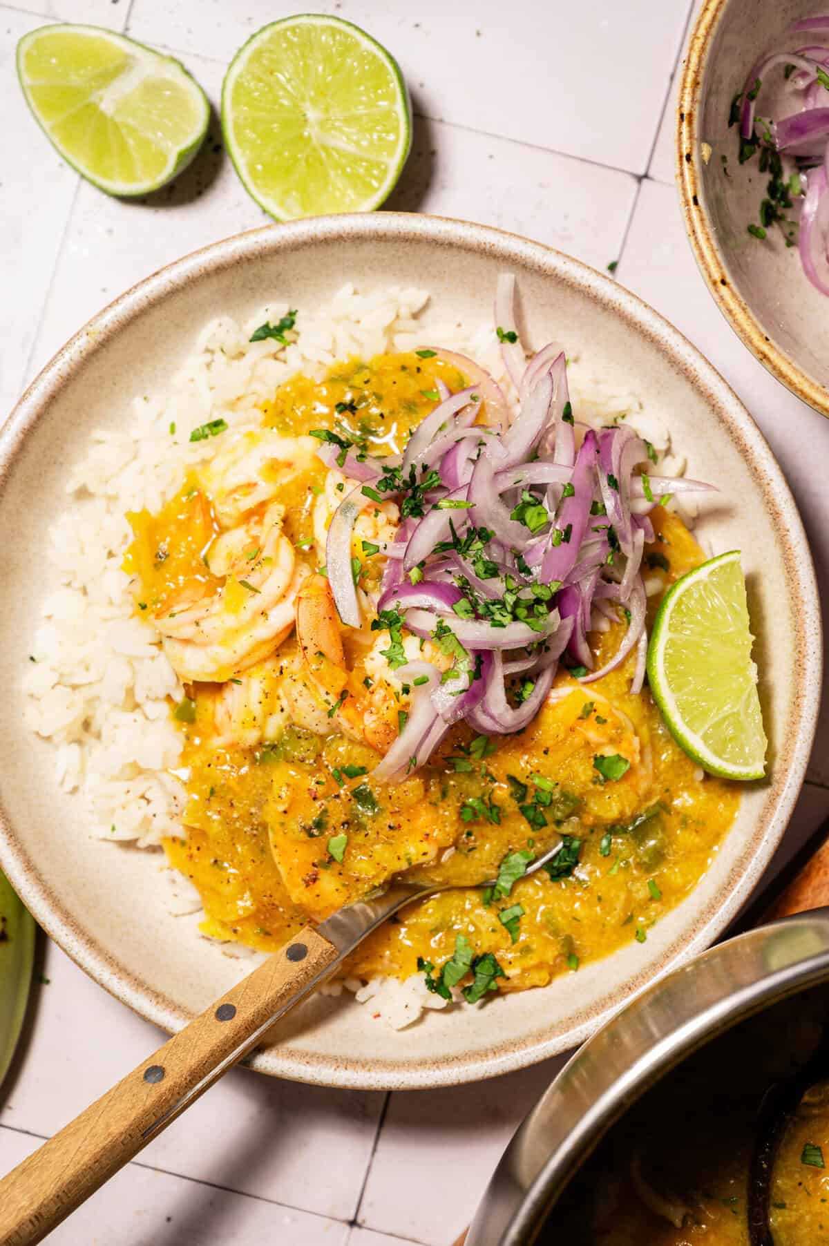 - Serve hot with white rice and top with pickled onions and extra cilantro.