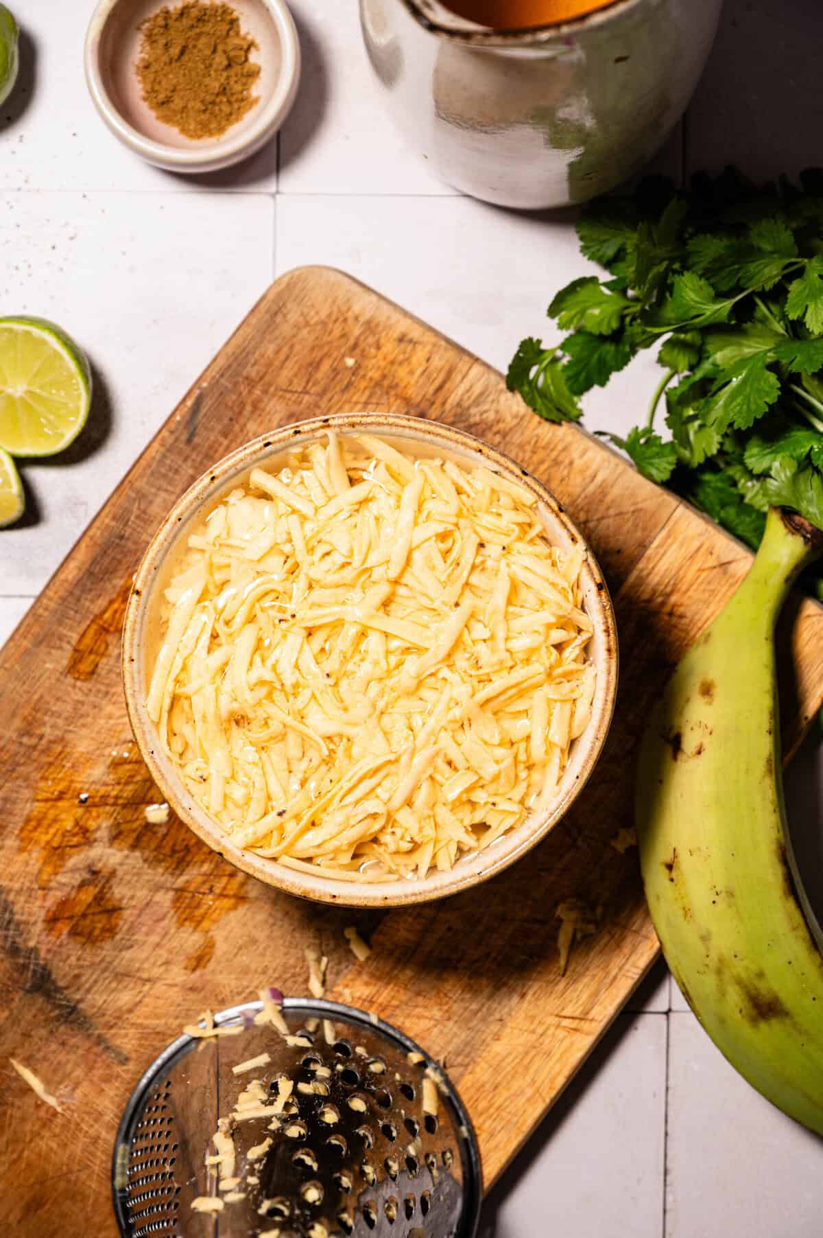 - Grate the three plantains and immediately mix them with about half a cup of the shrimp broth to keep them from browning.