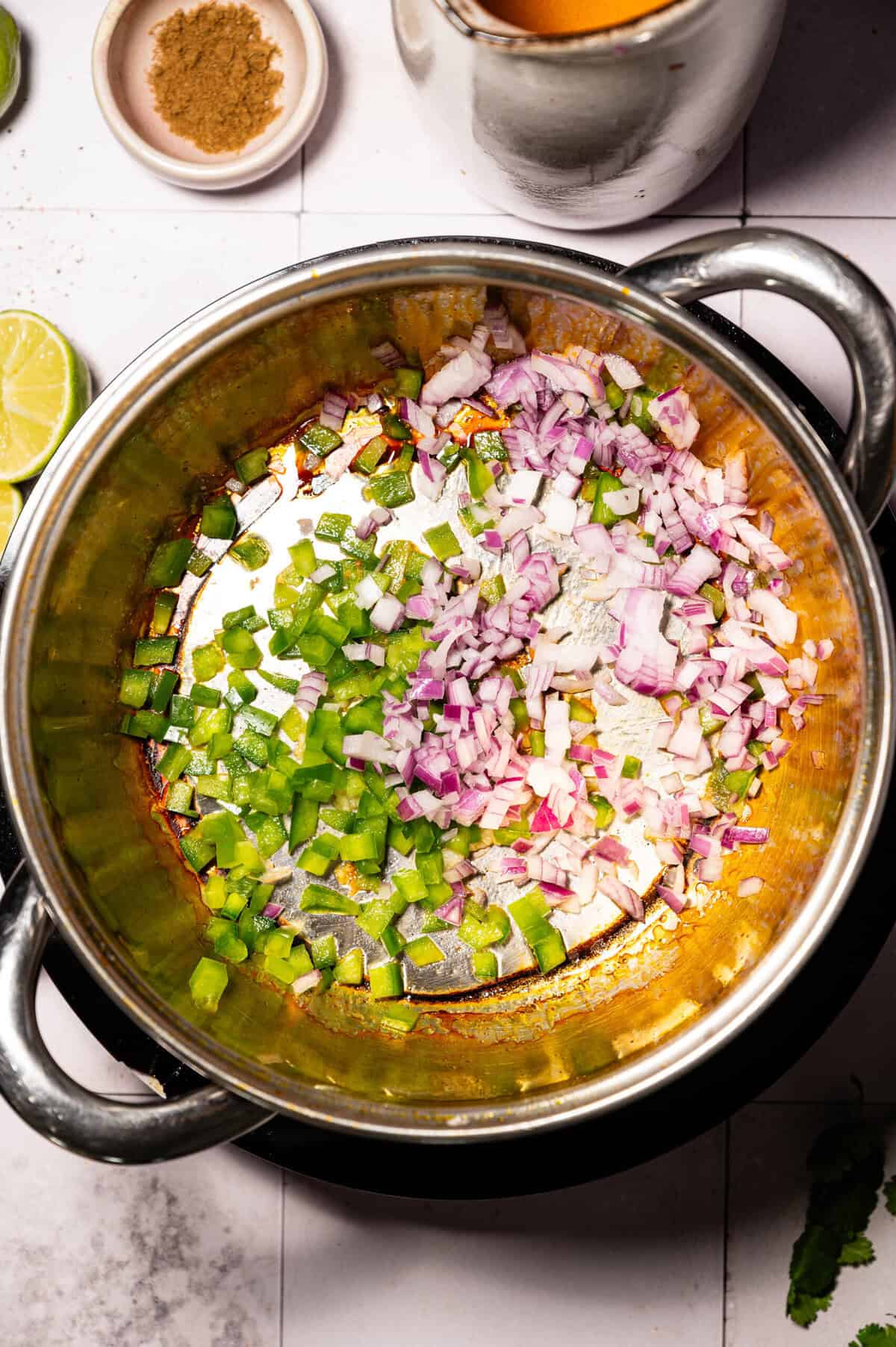 - Stir in the diced onion and bell peppers, season with salt, pepper, and ¼ teaspoon cumin, and cook for about 4 minutes until softened.