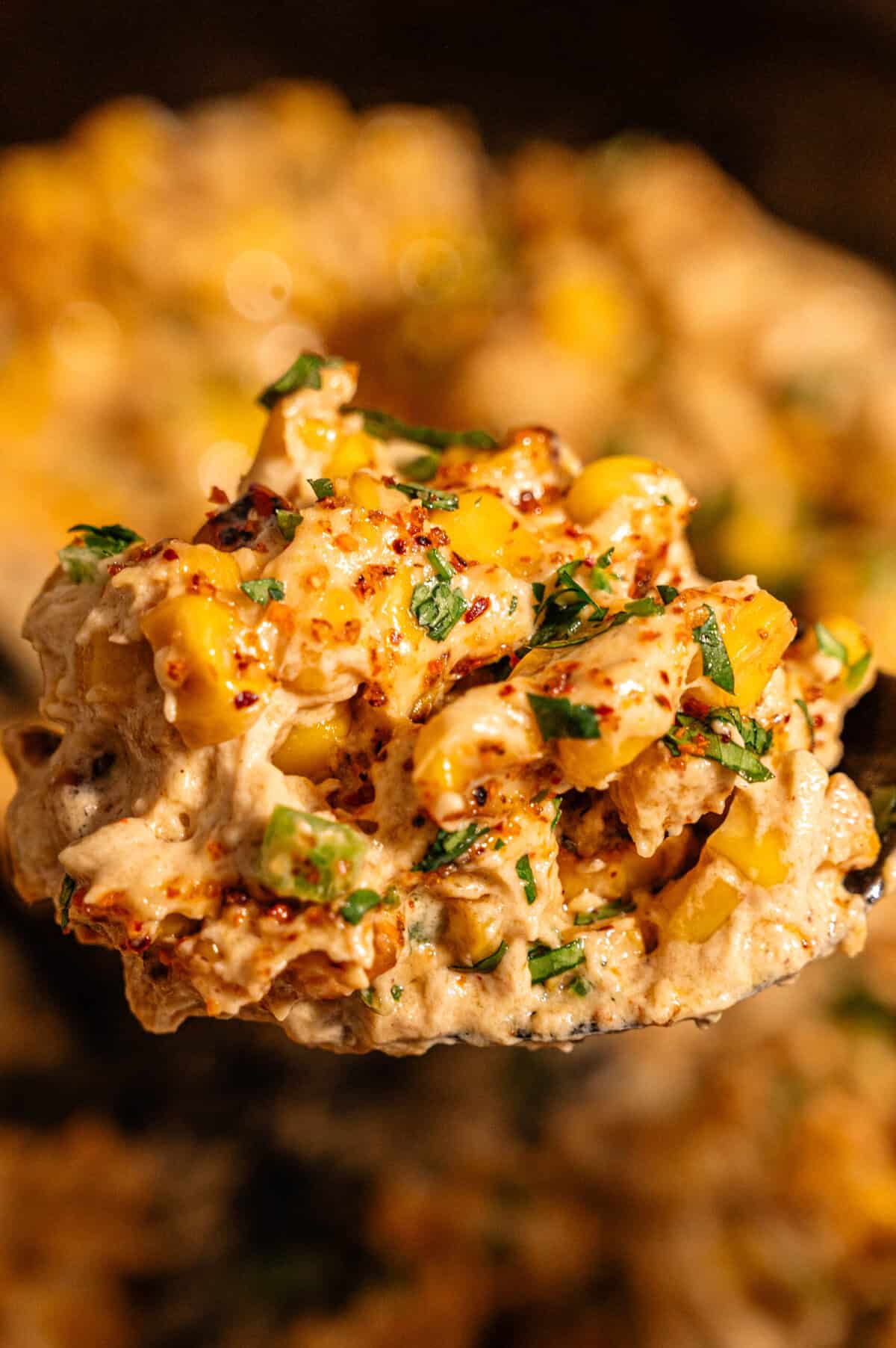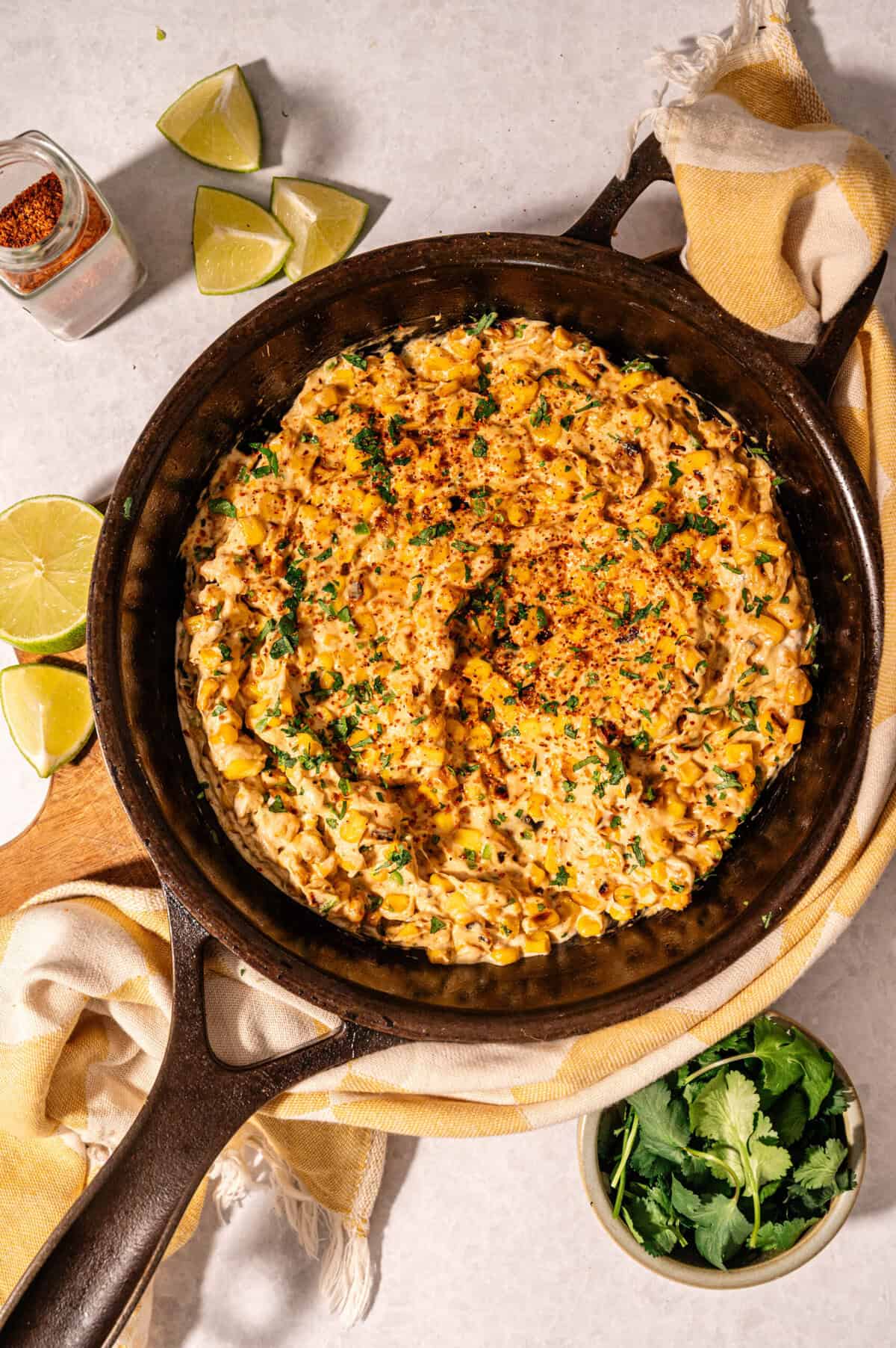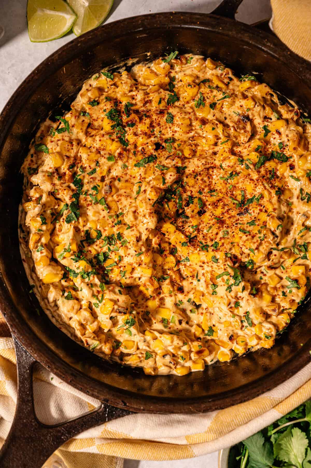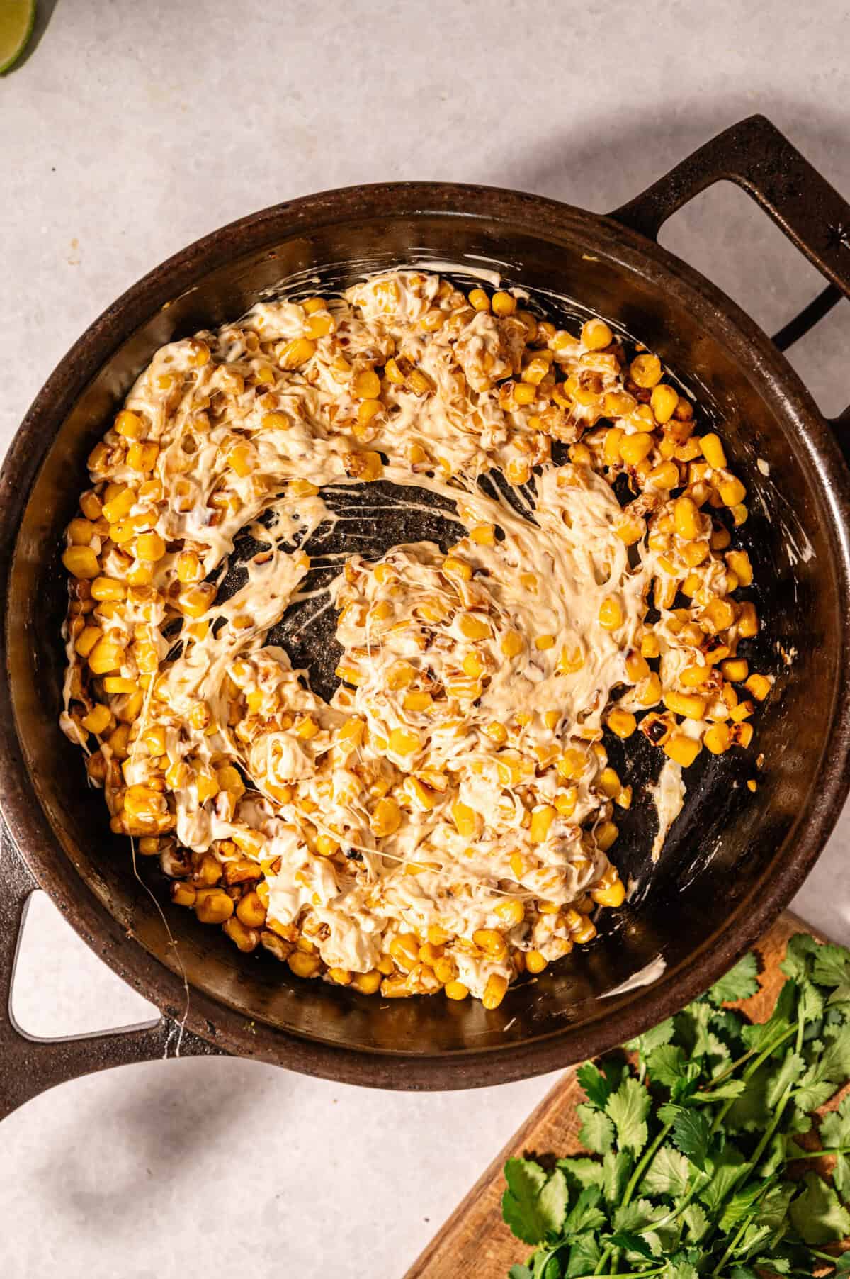 Scatter a generous amount of fresh cilantro over the top and serve immediately straight from the cast-iron skillet. The dip is best eaten hot while the cheese is still melted and the corn is still slightly sizzling.