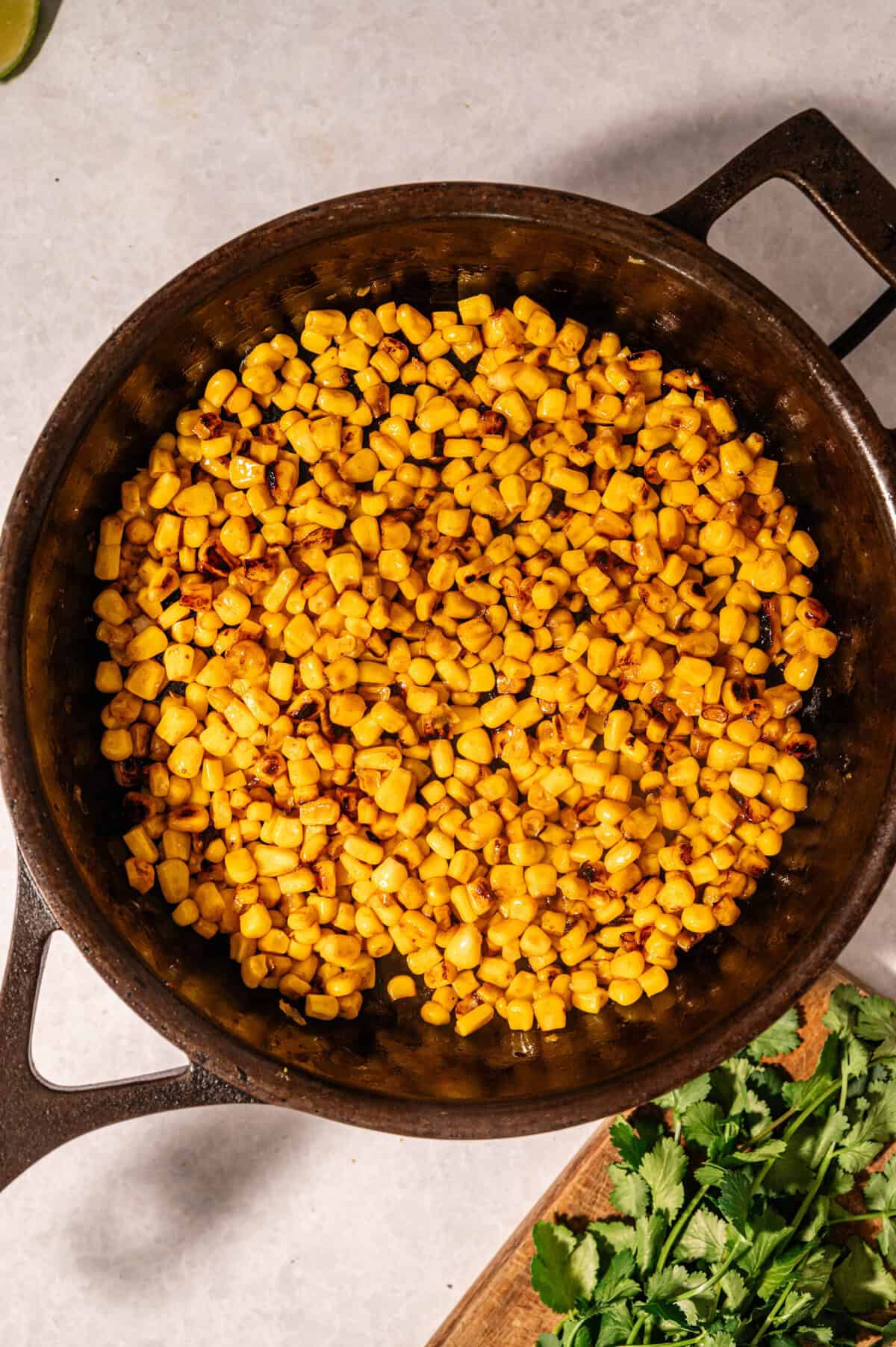 - Add the corn to the skillet and let it cook undisturbed for a few minutes until you see some charred spots.