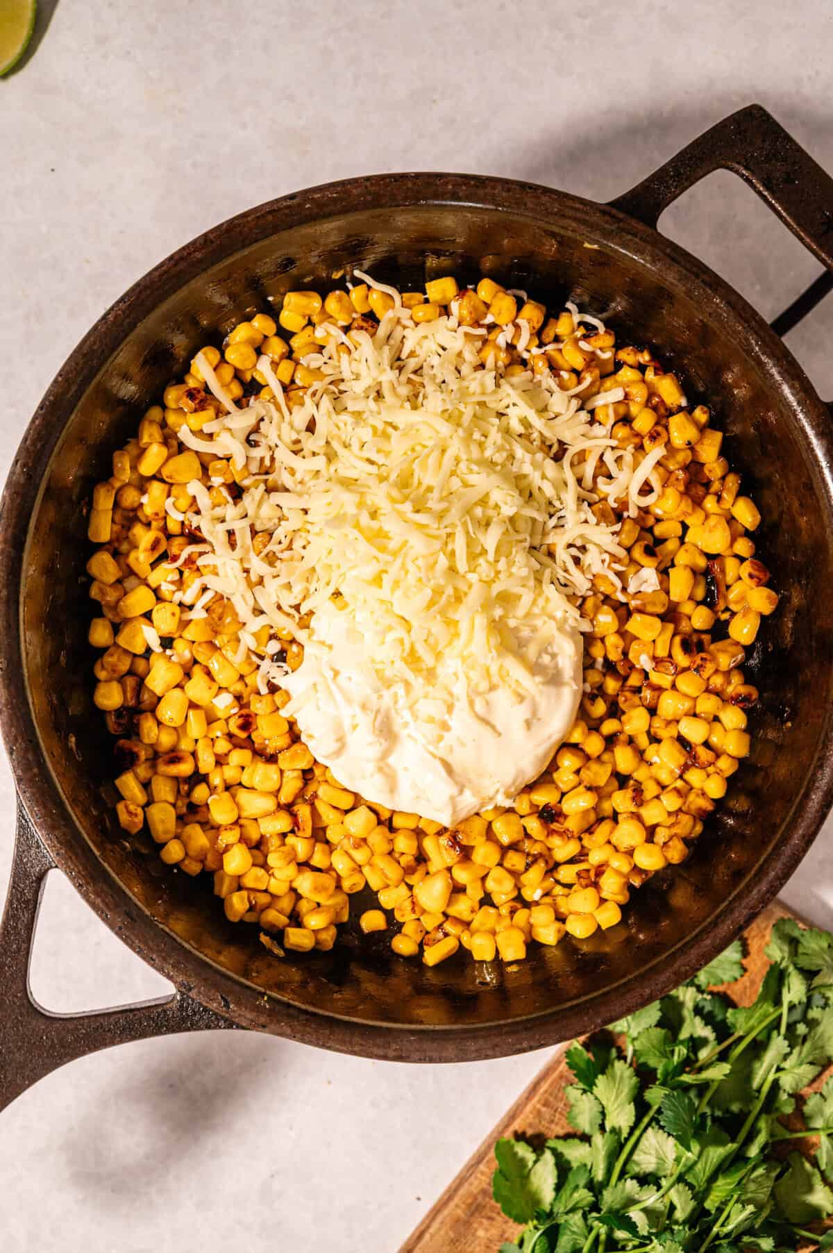 Once the corn has developed good charred spots on the bottom layer, stir it once to expose fresh kernels to the heat for another minute, then reduce the heat to medium. Add the remaining 3 tablespoons of butter, the mayo, and the grated white cheddar. Stir and fold everything together until the butter melts, the cheese incorporates smoothly, and the whole mixture becomes creamy and cohesive. This takes about 1 to 2 minutes.